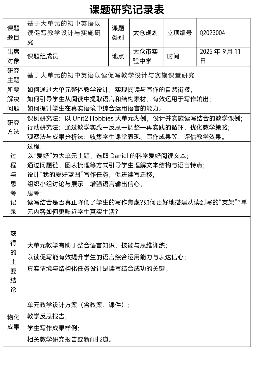 2025年9月11日下午第五节课,英语课题组开展了一堂基于《基于大单元的初中英语以读促写教学设计与实施研究》的课题研究课。本节课充分展现了单元整体教学模式下"以读促写"教学策略的有效实践。