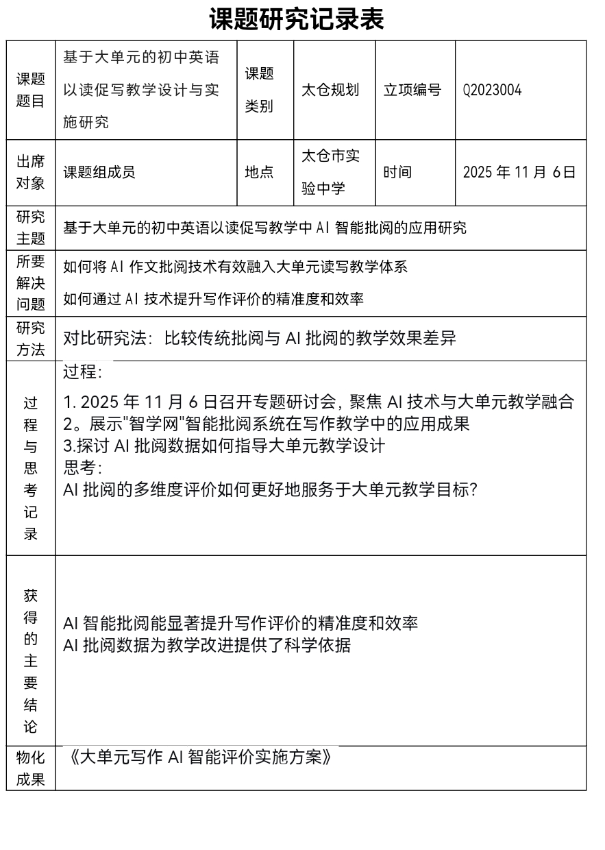 2025年11月6日下午,我校英语课题组围绕《基于大单元的初中英语以读促写教学设计与实施研究》展开深度研讨,本次研讨聚焦人工智能作文批阅技术与大单元教学的创新融合。