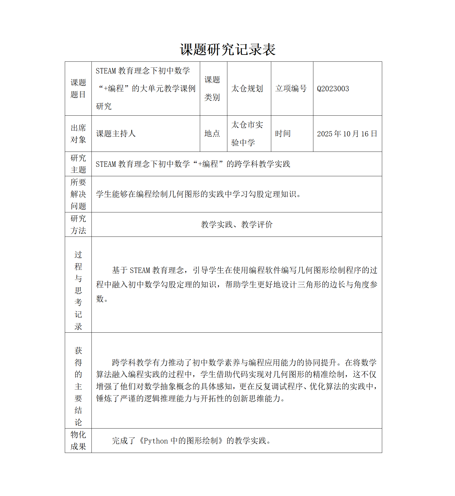2025年10月,太仓市实验中学开展了《Python中的图形绘制》跨学科教学实践,有力推动了初中数学素养与编程应用能力的协同提升。在将数学算法融入编程实践的过程中,学生借助代码实现对几何图形的精准绘制,学生得以从全新视角理解数学知识,在编写代码、调试运行的过程中,深化了对数学原理的认知,同时培养了系统性思维与创造性解决问题的能力。